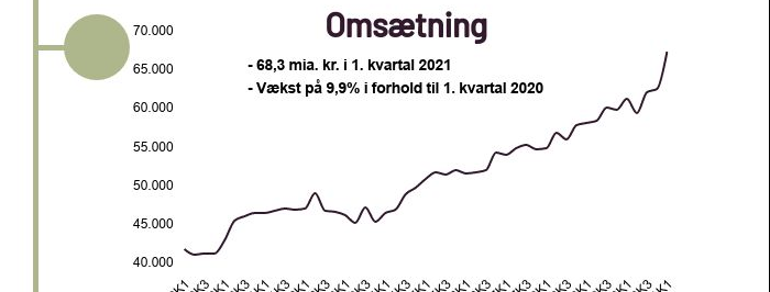 Nye tal fra Danmarks Statistik og Dansk Erhverv viser, at branchen i første kvartal af 2021 sætter ny omsætningsrekord på samlet 68,3 milliarder kroner.