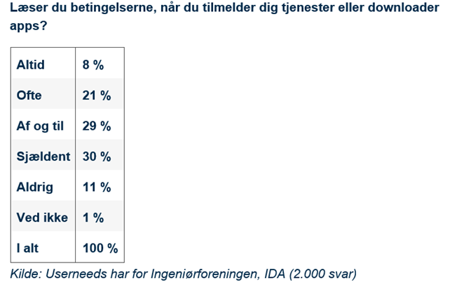 Og kun hver 20. svarer, at de sætter sig grundigt ind i, hvad de faktisk har accepteret.