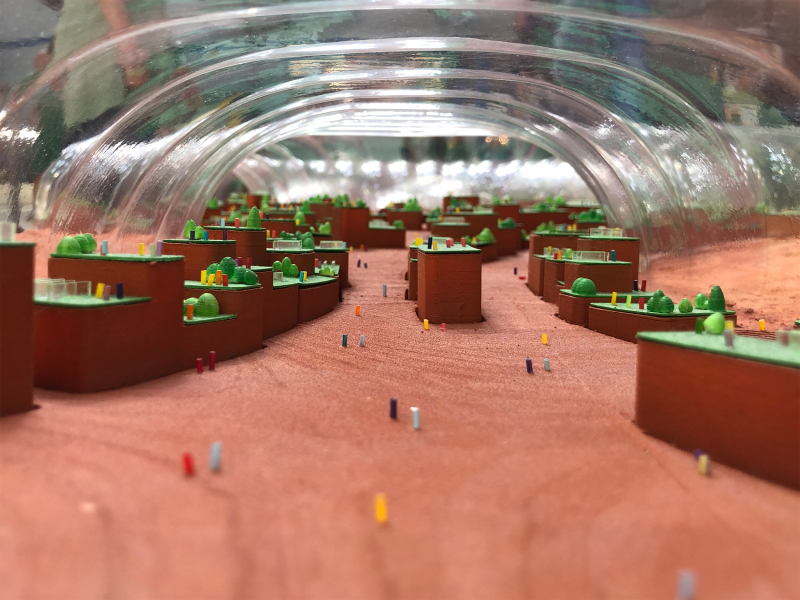 Man kan efterfølgende tage billeder af sine forskellige modeller og bud på boformer og få dem lagt ind i et rumlandskab. Så kan man her se, hvordan det ville tage sig ud på overfladen af en anden planet.
