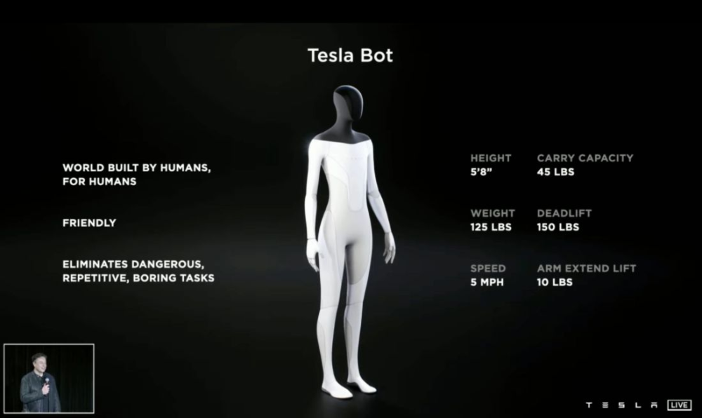 "Det er planen, at Tesla Bot skal være venlig og kunne navigere i en verden bygget til mennesker," siger han.