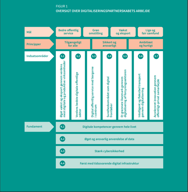Oven på ambitionen om en øget digitalisering af Danmark har partnerskabet formuleret en vision for et fundament, der omhandler digitale kompetencer, øget og ansvarlig anvendelse af data, cybersikkerhed og digital infrastruktur - se figur.