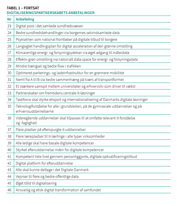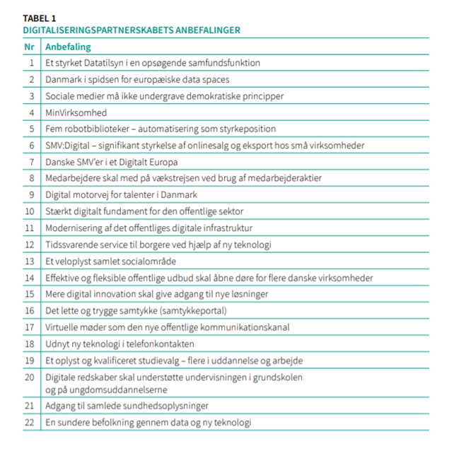 "Men de udgør vores bud på, hvordan vores samfund kan forbedres gennem implementering af digitale løsninger, øget brug af data og anvendelse af nye teknologier. Digitaliseringspartnerskabets anbefalinger udgør både forslag til at accelerere indsatser, der allerede er igangsat, samt nye initiativer."