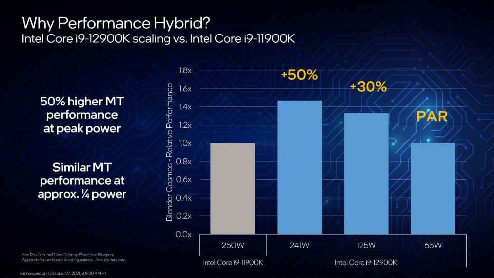 Strømforbruget for de nye processorer er dog afgørende. Tal fra Intels desktop-kollektion viser dog, at topmodellen Core i9-12900K kan matche forgængerens performance ved blot en fjerdedel af strømforbruget.