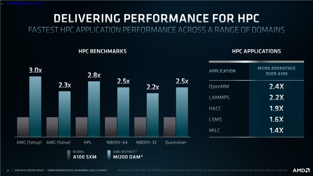 De grafiske acceleratorer vil kunne erhverves som modul (MI250, MI200) eller som plugin-kort (MI210) og hver enkel enhed vil kunne levere op til 383 TFLOPS ved et strømforbrug på op til 560 watt.