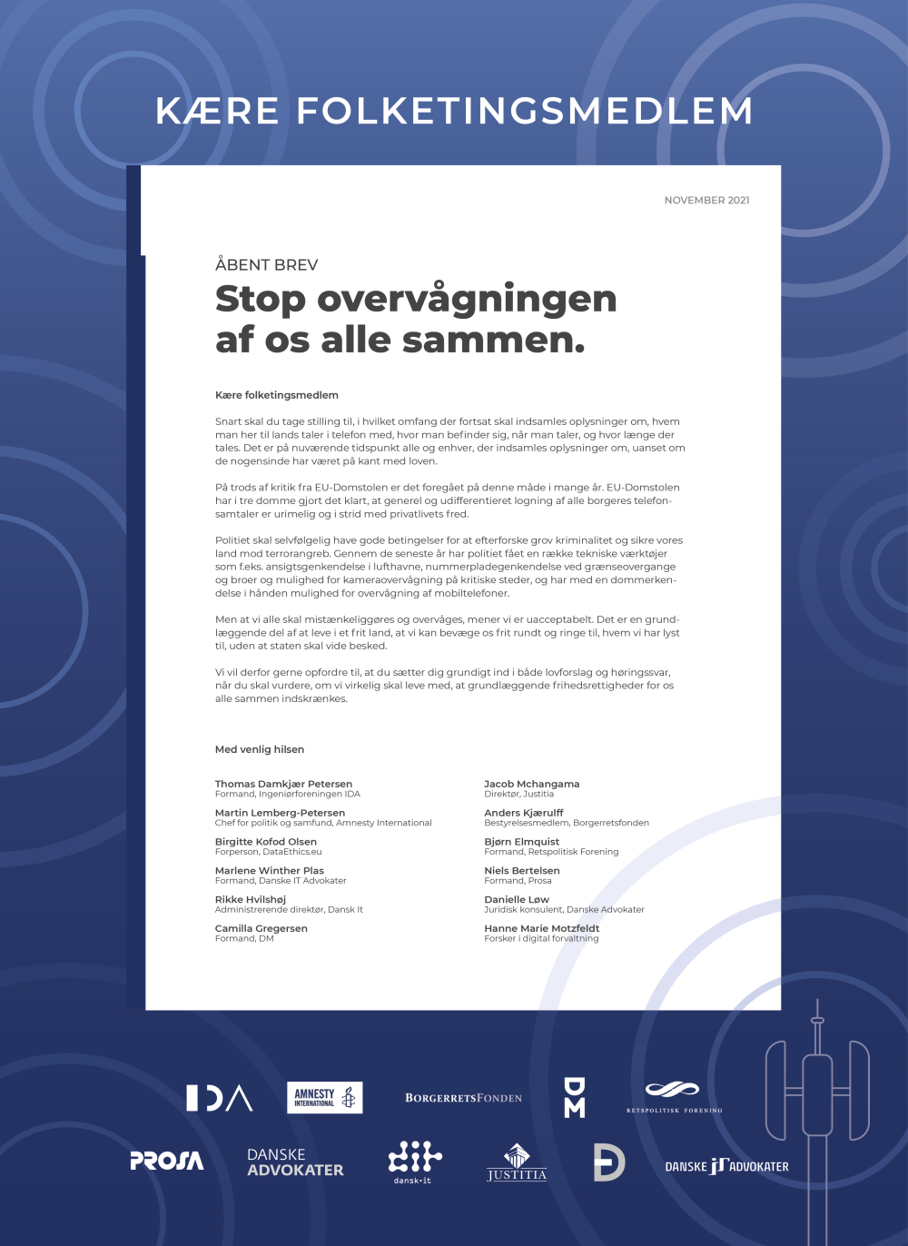 Bag brevet står formænd, chefer og direktører for Amnesty International, IDA, Justitia, DM, DataEthics, Dansk IT, Prosa, Danske IT-Advokater, Borgerretsfonden, Danske Advokater, Retspolitisk Forening, mens også forsker i digital forvaltning Hanne Marie Motzfeldt har skrevet under.