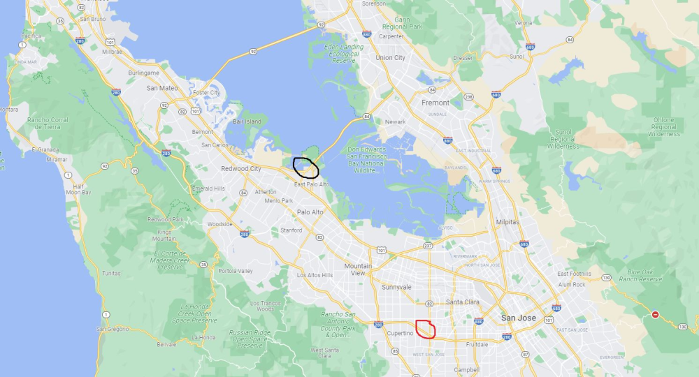 Facebook og Apple er naboer, og de to selskabers hovedkvarterer - Apple Park og Menlo Park - ligger blot 30 kilometer fra hinanden i San Fransciso-området.