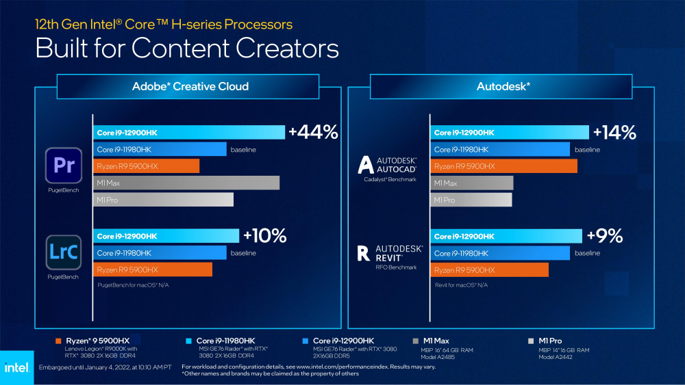 Denne skulle ifølge Intel selv kunne blæse konkurrencen af banen, ved at overhale både Apples vilde M1 Max og AMD’s stærke topmodel R9 5900 HX i praktiske discipliner såsom Adobes Premiere og Lightroom samt Autodesks CAD og Revit-programmer.