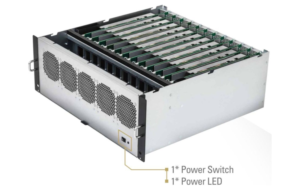 Løsningen sælges i rack-format og trækker op til to gange 1200 watt, for at drive de 12 computere, som er indrettede som indstikskort.