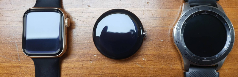 Sammenlignet med Apple Watch 40mm og et Samsung Galaxy Watch i 46mm, ligner uret blot en sort, smuttet sten med dimensioner der kommer tæt på Apples lille fikse wearable.