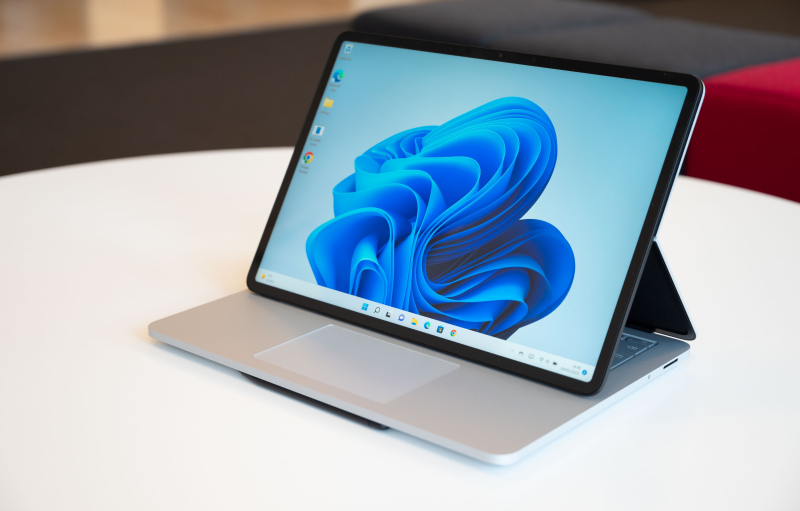 I Surface Laptop Studio forsøger Microsoft sig så med et alternativt skærmhængsel, som gør det muligt at lade displayet vende omkring sig selv og ligge fladt ovenpå basen, hvor tastatur, og al indmaden ligger.