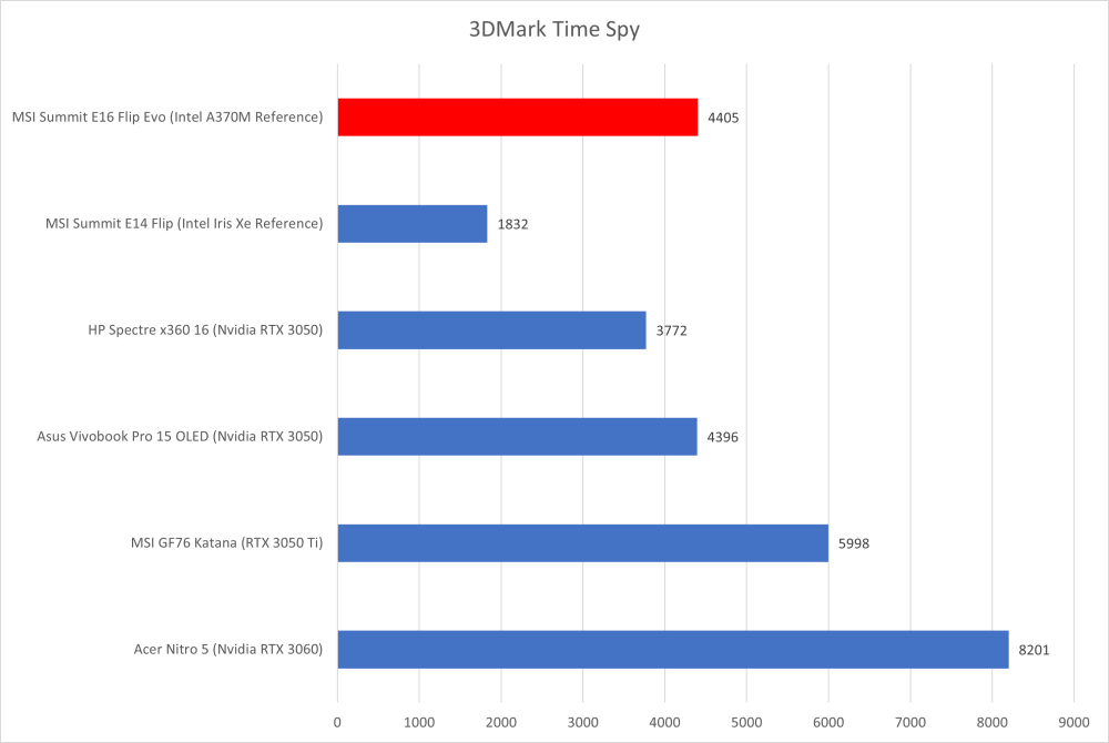 Den første disciplin som Intels nye grafikkort dyster i er i benchmark-programmet 3DMark Time Spy, hvor den formår at overhale de RTX 3050 baserede maskiner, mens den overhales af de kraftigere RTX 3050 Ti og RTX 3060 baserede bærbare.