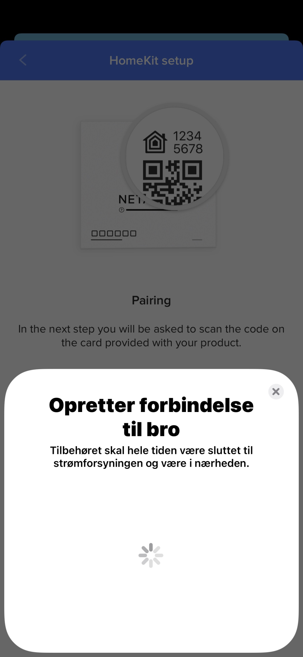 Jeg hentede derfor appen manuelt og starter setup. Her bliver du bedt om at scanne en QR kode på selve vejrstationen. Men ak - igen må jeg igennem mange forsøg og lange ventetider.