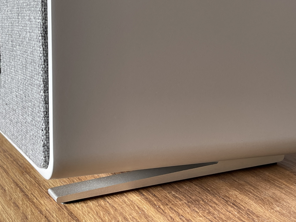 Her er nydelige detaljer som ægte stof på fronten og lækre runde kanter. Finish i flot træ eller hvidlakeret ditto. Det hele flankeret af fødder i poleret aluminium. Jeg er solgt.