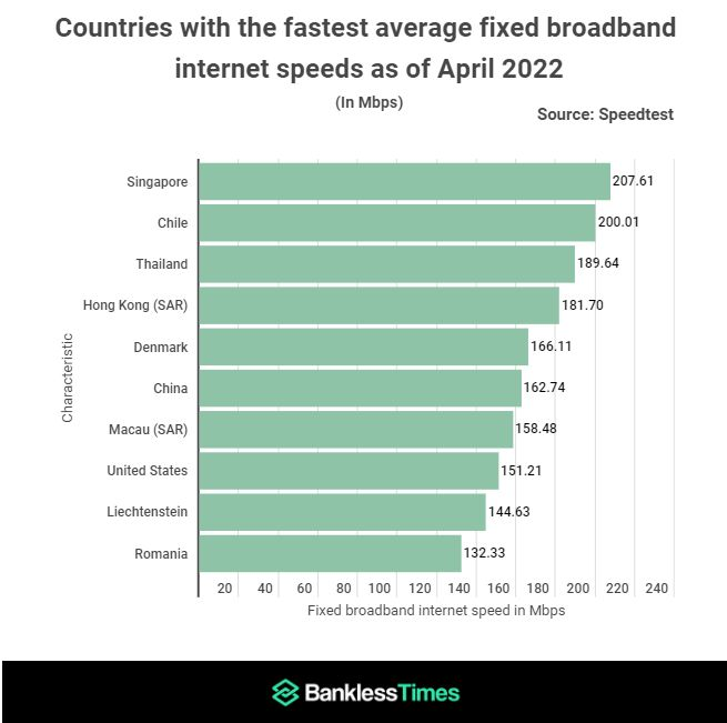 Hurtigst af alle lande er Singapore, hvor befolkningen er sikret en gennemsnitlig download-hastighed på 207,61 Mbps.