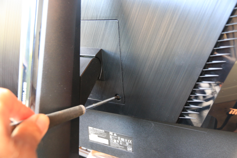 Skærmens tyngde understreges også af, at den ikke bare kan klikkes bag på foden. Den kræver to skruer i bunden. Ikke noget problem, men lidt usædvanligt.