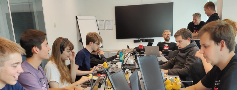Går man væk fra den menneskefyldte hal, der udgør ITU's midte og tager elevatoren op på anden sal, så har ni unge hacker-entusiaster sammen med deres trænere forskanset sig i et mødelokale på en af de mørke gange.