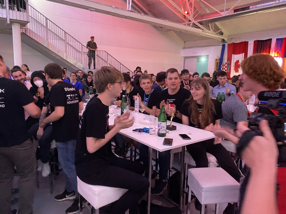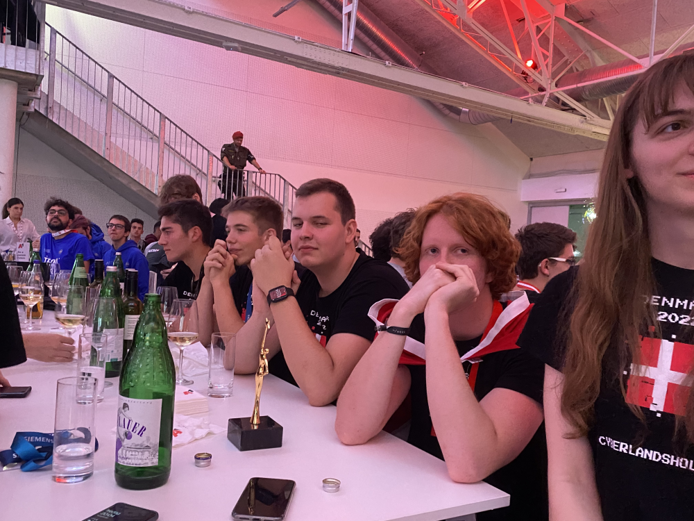 Det franske hold går på scenen og modtager medaljer og klapsalver fra salen. Man kunne ikke tro, det kunne lade sig gøre, men nu stiger spændingen endnu en oktav ved det danske bord.