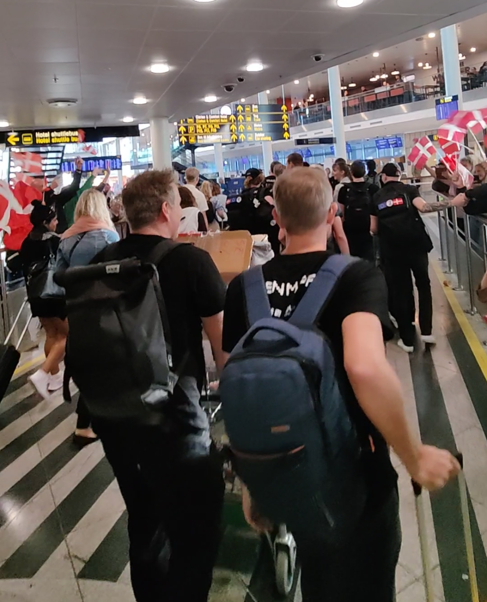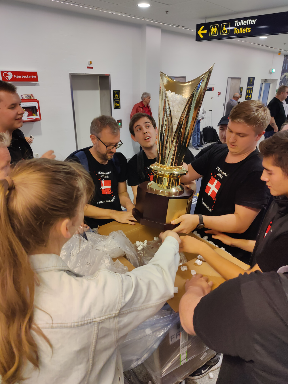Det er dagen derpå for EM-vinderne. Det danske cyberlandshold er på vej til gate F26, hvor de skal boarde 15.10.
