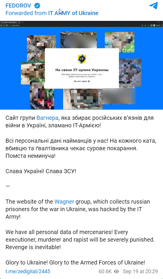 På den hackede hjemmeside bliver man mødt af brutale billeder fra det, der må formodes at være dræbte Wagner-lejesoldater samt en tekstboks, som de ukrainske hackere har efterladt.