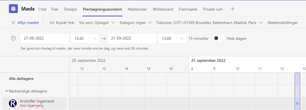 Når du skriver din invitation, skal du klikke på Planlægningsassistent øverst i udfyldningsformularen. Denne kan også benyttes senere, hvis du skal redigere mødet.