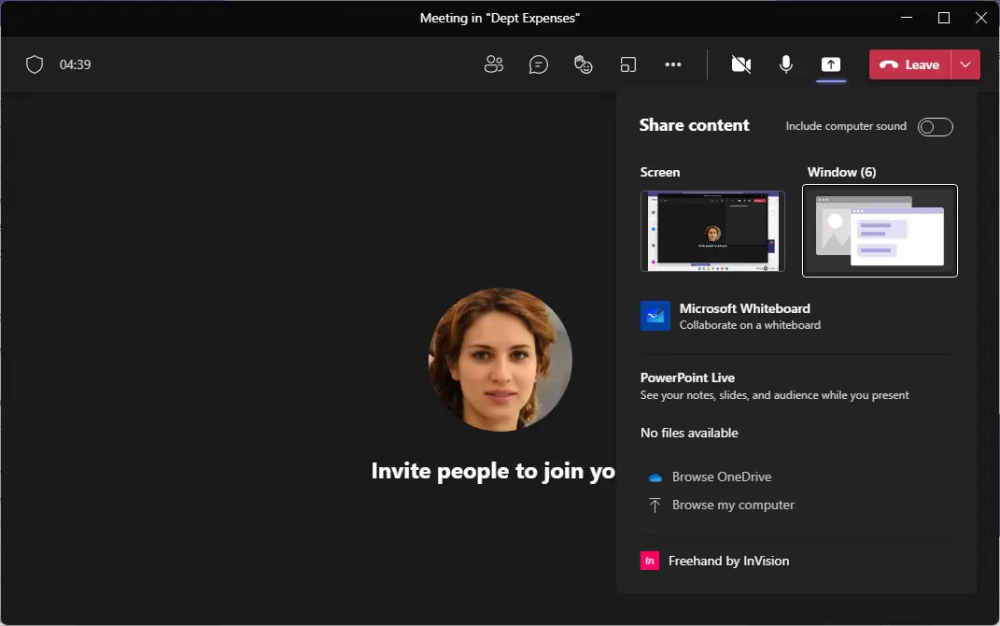 På mødekontrolværktøjslinjen øverst på Teams-mødeskærmen skal du klikke på ikonet for en op-pegende pil inde i en firkant.