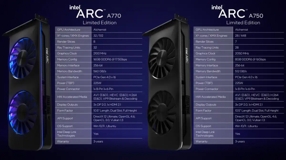 Selve kortene er udstyret med Intels DG2-512 chip, som er fremstillet med 6nm printteknologi. Altså en procesgang nyere end de 7nm- og 8nm-teknologier, som Nvidia og AMD benytter i deres midrange-kort.
