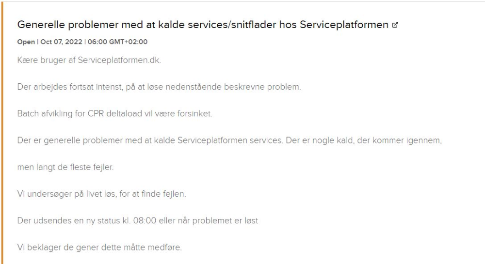 ”Kære bruger af Serviceplatformen.dk. ”Der arbejdes fortsat intenst, på at løse nedenstående beskrevne problem. Batch afvikling for CPR deltaload vil være forsinket. Der er generelle problemer med at kalde Serviceplatformen services. Der er nogle kald, der kommer igennem, men langt de fleste fejler” skriver IBM Service Desk i beskeden, da IBM står for driften af siden.