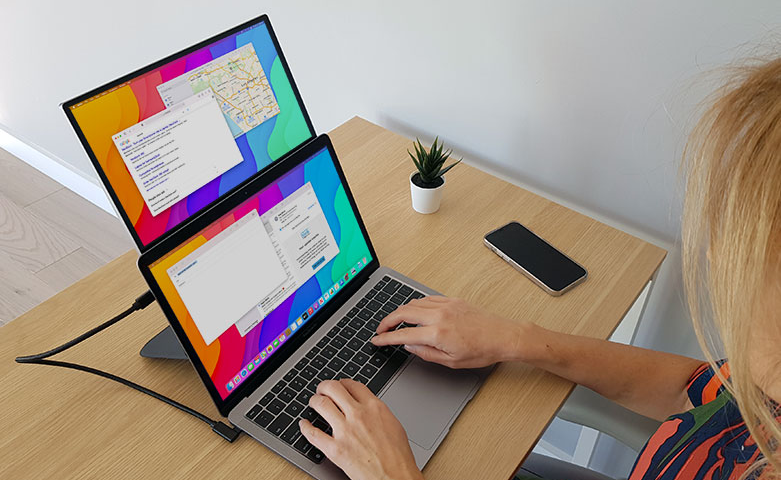 Her tilbydes en 12 tommer stor Full HD skærm, der modsat de andre alternativer kan fæstne magnetisk til bagsiden af ens laptop.