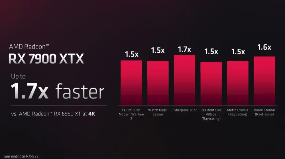 Her fremgår det ifølge AMD’s egne tal, at RX 7900 XTX yder mellem 50 og 70 procent højere ved 4K-opløsninger i udvalgte spildiscipliner.