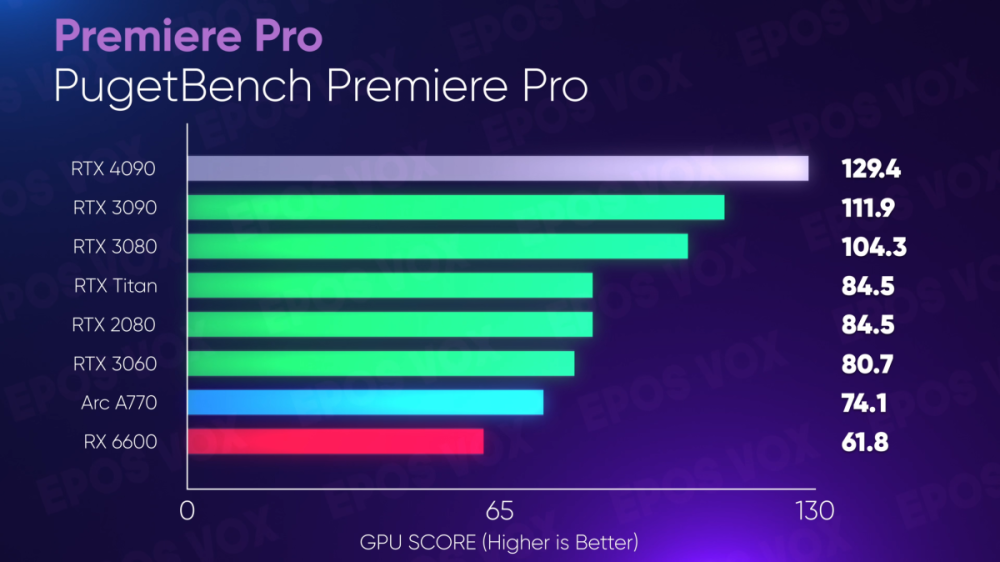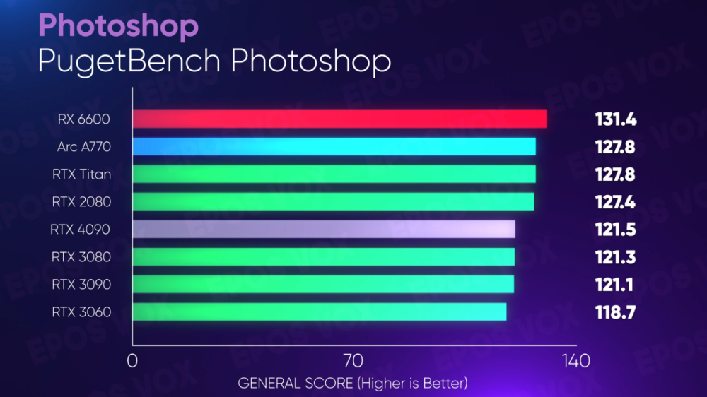 Det ses tydeligt i Pugetbenchs respektive benchmarks i de to discipliner, hvor Nvidias topkort placerer sig i midten af feltet, hvor langt billigere mellemklasse-kort som RTX 3060 og AMD’s RX 6600 gør en mindst lige så god figur.