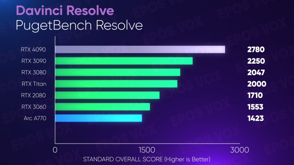 I programmet Davinci Resolve er performance-differencen endnu mere markant. Her scores hele 2780 points mod 2250 for RTX 3090 – altså hele 24 procent højere ydelse.