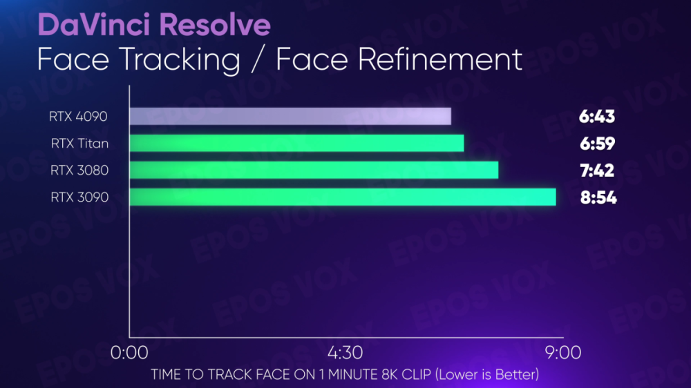 Når et program for alvor kan udnytte de massive 24 gigabyte ram, bliver forskellene enorme. Et 8K-projekt med H.264 komprimering i DaVinci går her fra at vare 24 minutter og 17 sekunder til bare 17 minutter og 12 sekunder.