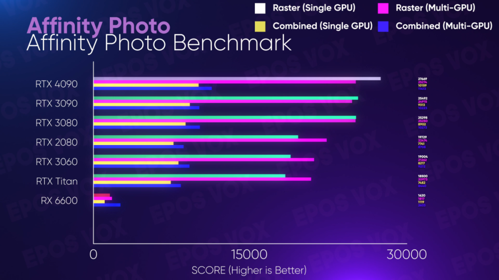 RTX 4090 gør det til gengæld meget bedre i en anden app, Affinity Photo, hvor den igen placerer sig i dens naturlige topposition, som dens pris dikterer.