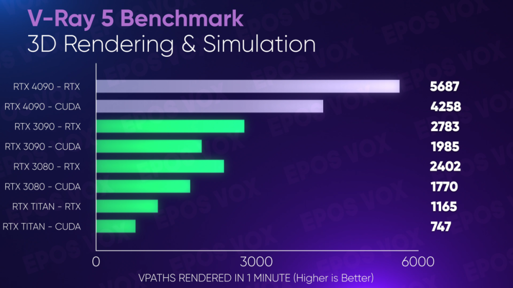 I programmet V-Ray 5’s benchmark leveres 5687 frames per minut mod 2.783 frames per minut med et RTX 3090.