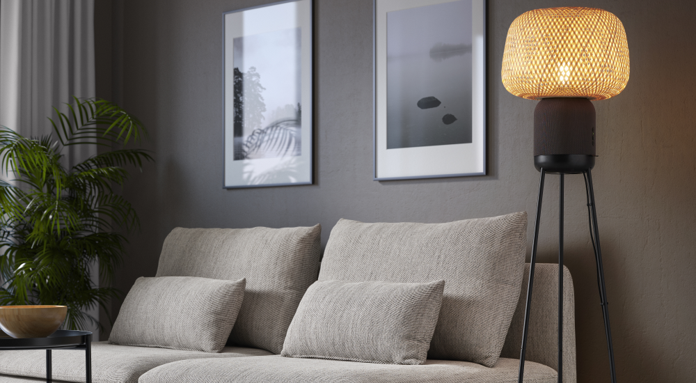 Lampen har mange af de samme træk som den oprindelige Symfonisk bordlampe, men altså her hævet et godt stykke over gulvet og iklædt en ny skærm i bambus. Skærmen kan skiftes ud med de øvrige skærme i Symfonisk-serien, skriver Ikea.