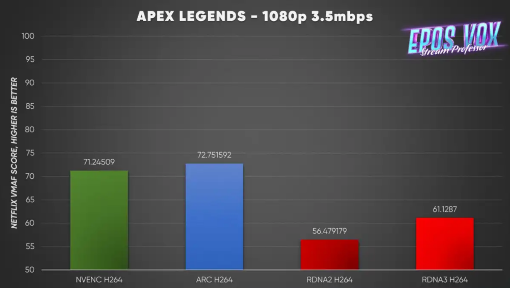 Når det gælder video-streaming viser scoren fra Netflix’ VMAF test at være markant forbedret i forhold til ældre AMD generationer, mens der dog fortsat er lidt vej op til Nvidia og testens duks fra Intel.