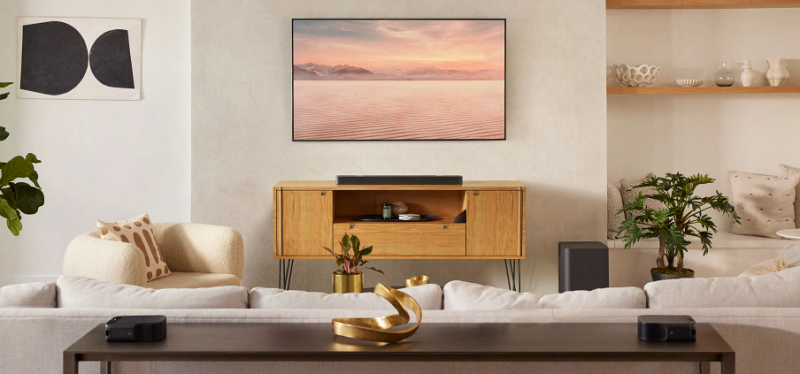 De har opnået effekten via hele 15 højttaler enheder. Der sidder to i hver af de aftagelige baghøjttalere. En til subwooferen og resten i lydbaren, hvor to af dem vender op mod loftet, så der kan opnås Dolby Atmos lyd.
