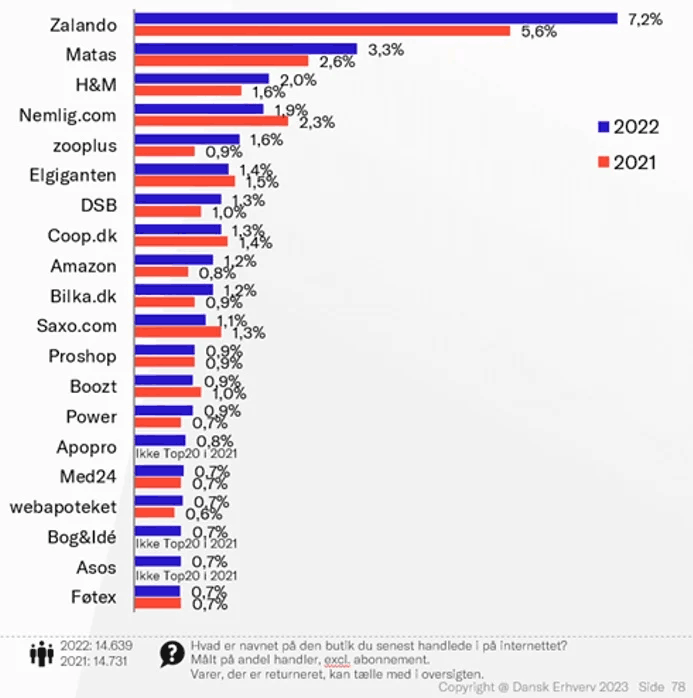 Top 20 i E-handelsanalysen 2022 fra Dansk Erhverv toppes af de kendte sværvægtere Zalando og Matas, som tilsammen står for hver 10. handel på nettet i Danmark. Men nye navne bl.a. Apopro og Bog & Ide er også med på listen.