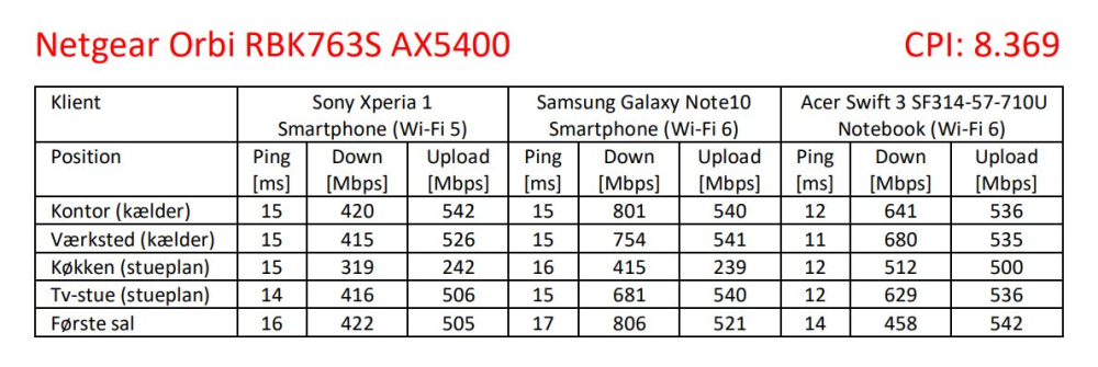 Derefter måler jeg ping samt down- og uploadhastigheder på fem positioner i huset. Dette giver 45 måleresultater totalt, og for at lette overblikket koger jeg summen af de 15 downloaddata – de afgørende for problemfri streaming – ned til en talværdi, som jeg har døbt CPI (Connected Performance Index).