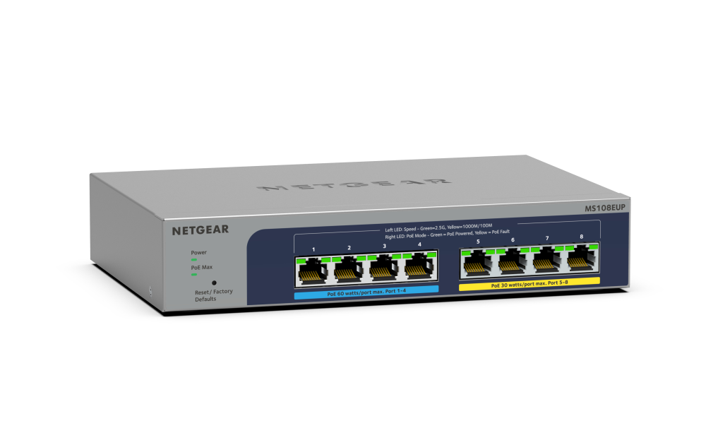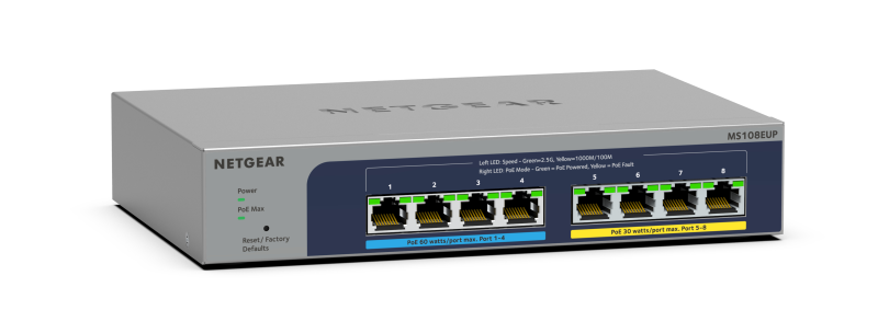 Netgear MS108EUP er en meget kompakt switch med otte 2.5GbE-porte og kapacitet til at strømforsyne adgangspunkter og andre opkoblede PoE-enheder via LAN-kabler. Den tilhørende strømforsyning på 254 W er en næsten lige så stor klods på knap et kilo.