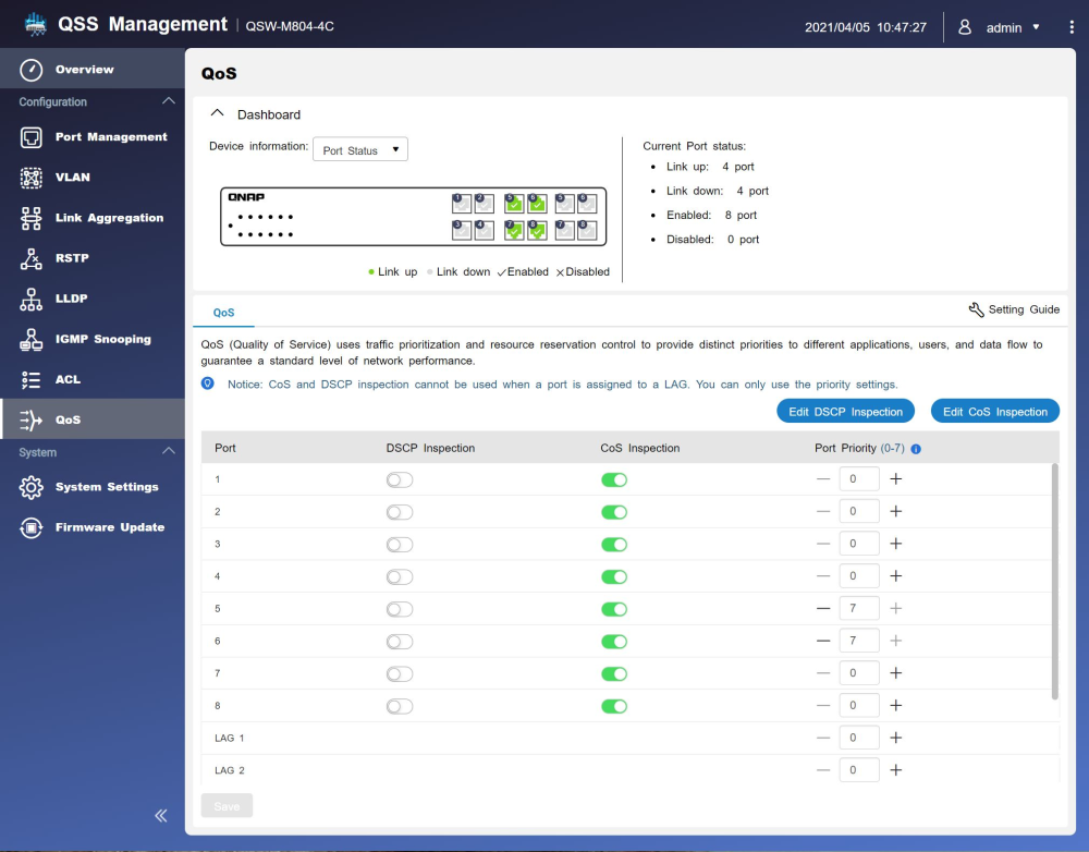 Blandt QSW-M804-4C-switchens udfordrende mange indstillinger – se alle menupunkterne i venstre kolonne – er QoS (Quality of Service) eller prioritering af tilsluttede enheder. Jeg har sat port 5 og 6, som jeg bruger til henholdsvis internetmodem og hovedcomputer, til det højeste niveau – 7. (Foto: Knud Søndergaard / Computerworld / Knud Sondergaard)