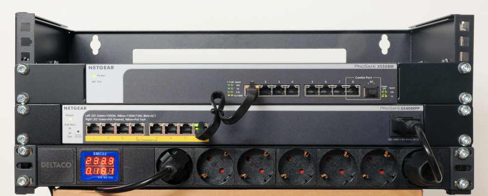 Et lille professionelt server-rack som denne model fra Deltaco er perfekt til en switch-farm. Her er det foreløbig monteret med to Netgear-switche og en strømskinne med måleinstrumenter. Og det er kun begyndelsen! (Foto: Knud Søndergaard / Computerworld)