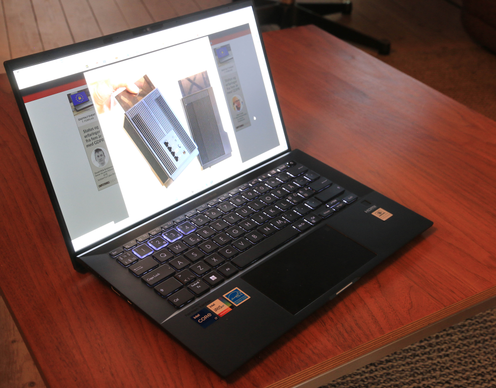 Intel Iris Xe grafikprocessoren er godt med – ikke mindst fordi i7-processoren tydeligt kan nappe en del af opgaven. Så selv på grafik opleves den hurtigt.