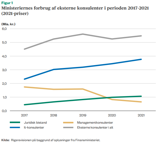 Desuden konstaterer revisionen, at der, trods et fald i brugen af eksterne konsulenter siden 2019, er sket en stigning af brugen af it-konsulenter og juridisk bistand siden 2017.