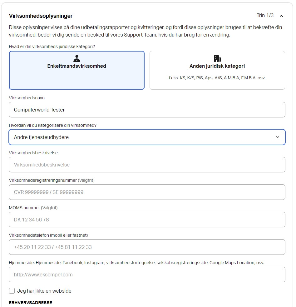Her skal du opgive din virksomhedsprofil adresse og eventuelt andre nyttige oplysninger såsom CVR- og moms-nummer samt hjemmeside og kontaktoplysninger.
