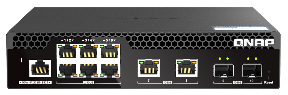 Qnap QSW-M2106R-2S2T er en meget avanceret switch med managementfaciliteter og et stort udvalg af tilslutninger – fire med 10G og seks med 2.5G hastighed.