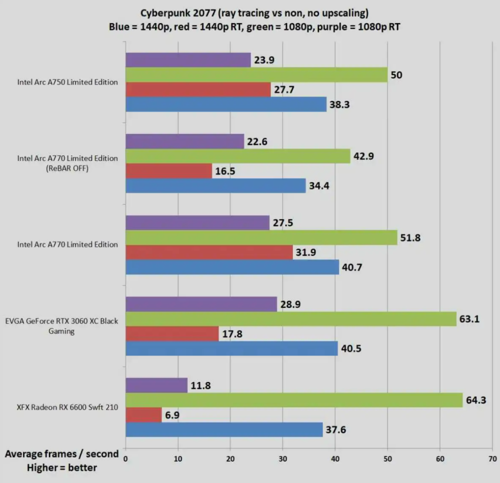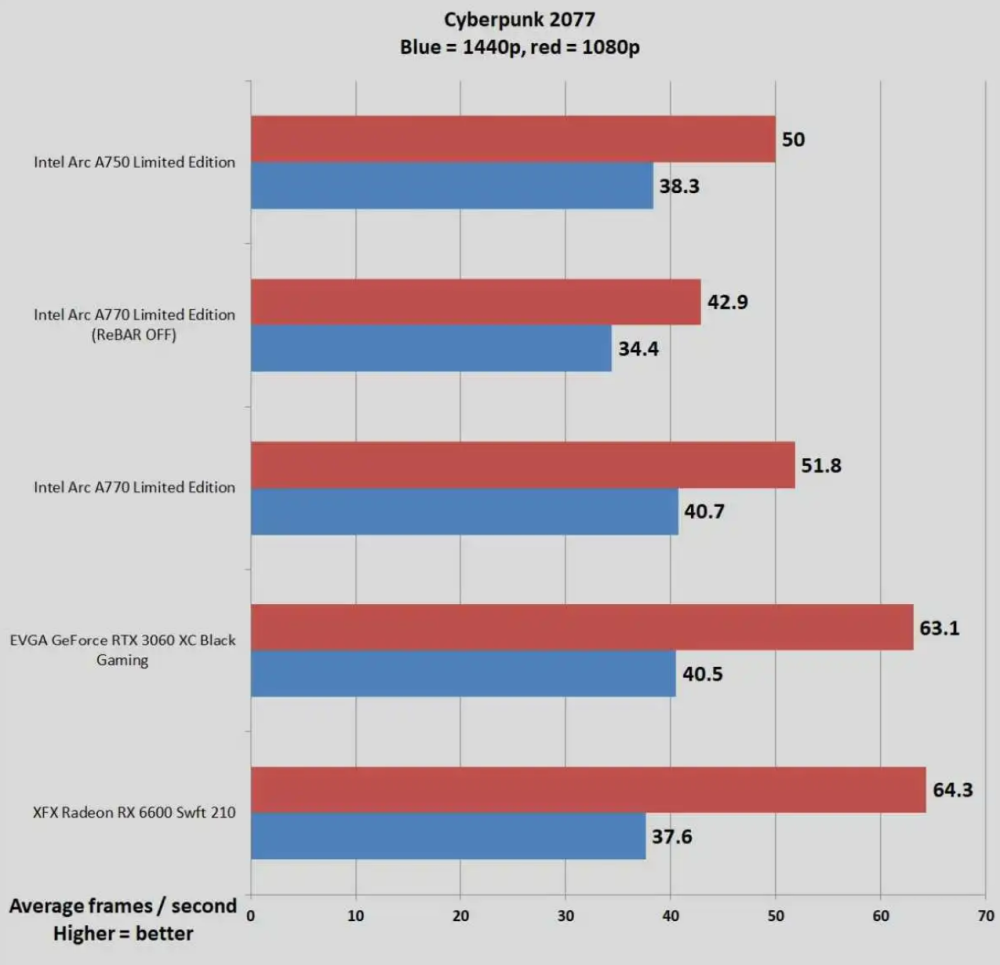 Det forhold ses tydeligt i et spil som CyberPunk 2077, hvor Intels kort blot leverer 50 fps ved 1080p opløsninger mod 64,3 fps hos AMD.