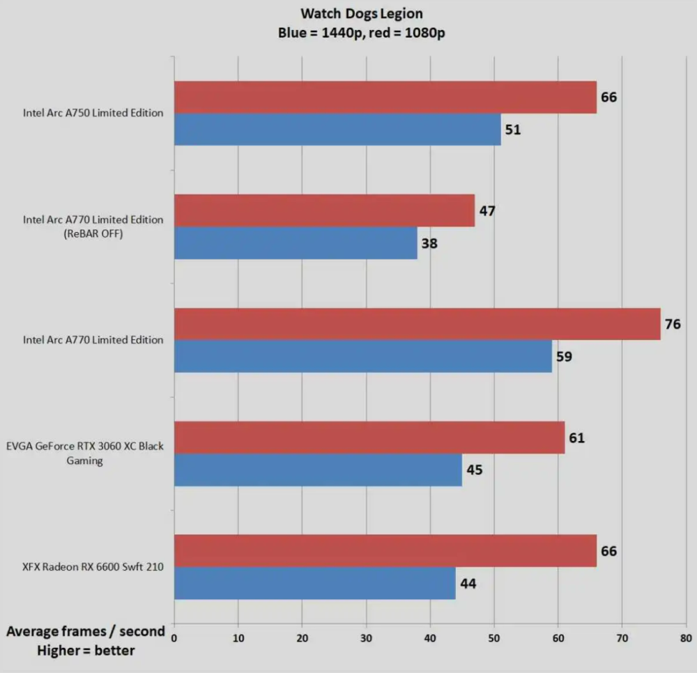 I et andet spil som Watch Dogs Legion matcher de to kort hinanden og leverer 66 fps, mens Intel igen trækker fra ved de høje opløsninger.