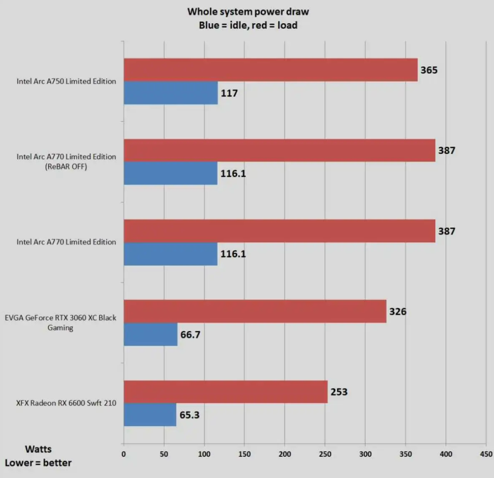 Her viser Intels Arc A750-kort at være næsten lige så forslugent som et regulært high-end grafikkort.