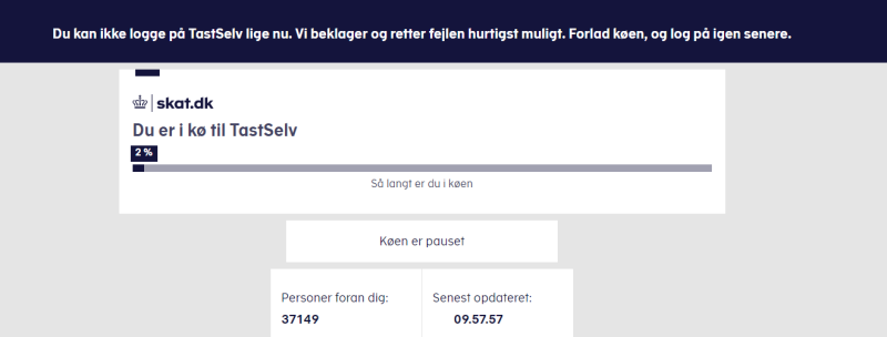 "Du kan ikke logge på TastSelv lige nu. Vi beklager og retter fejlen hurtigst muligt. Forlad køen, og log på igen senere," lyder beskeden på skat.dk.
